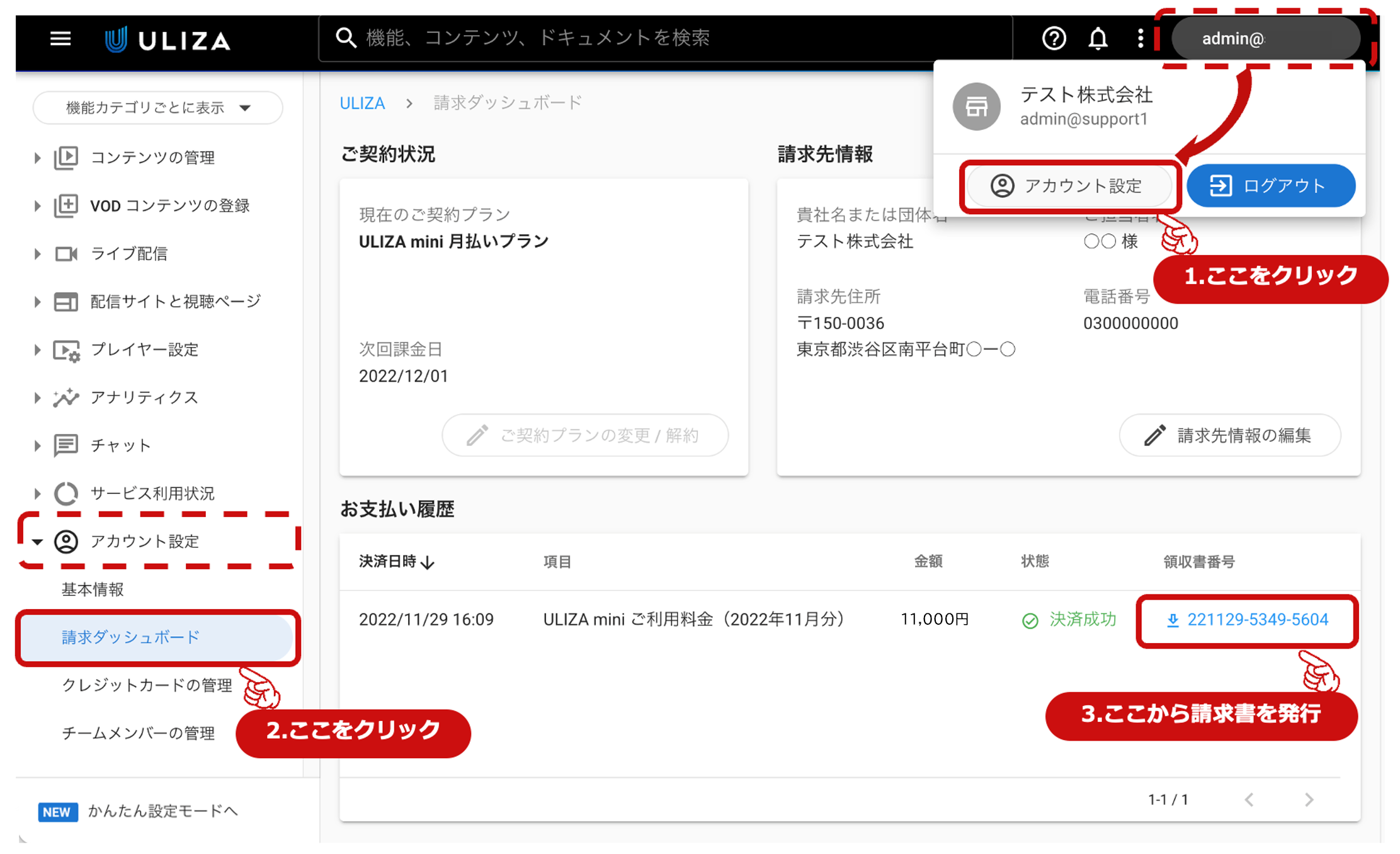 1.ULIZA管理画面を開き、画面右上のアカウント名をクリックし「アカウント設定」を開きます