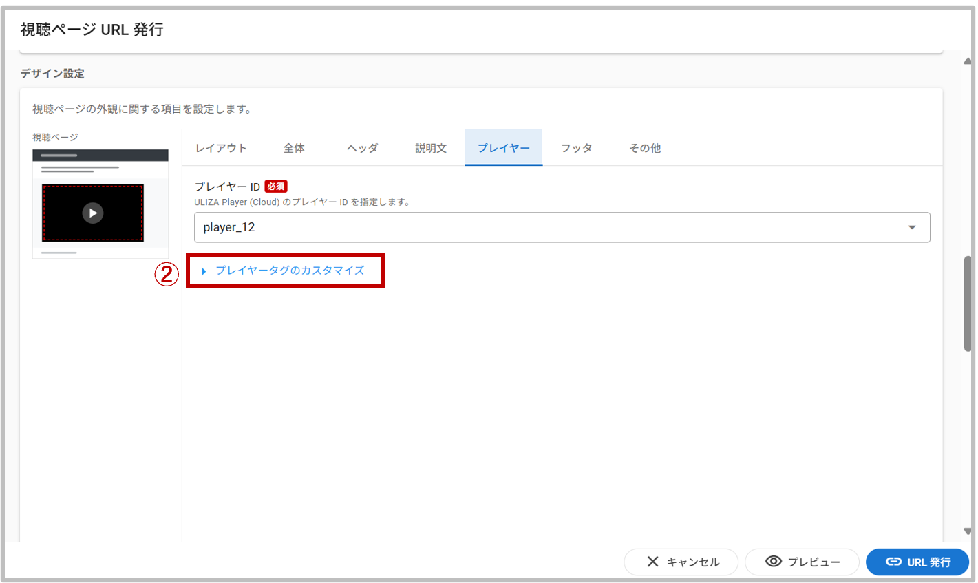 ②デザイン設定セクションの「プレイヤー」タブにて、「プレイヤータグのカスタマイズ」をクリックします
