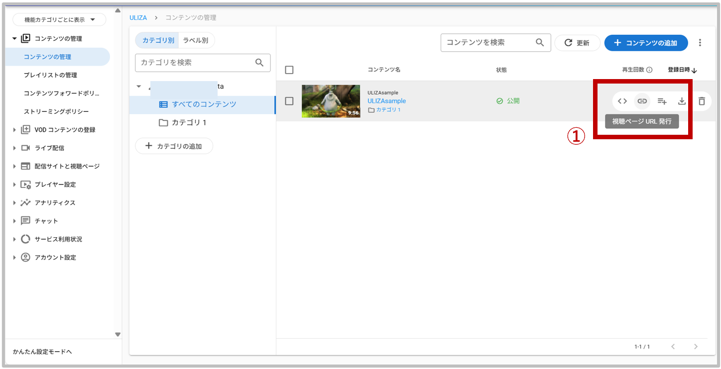 ①「コンテンツの管理」にて、対象コンテンツの視聴ページURL発行をクリックします