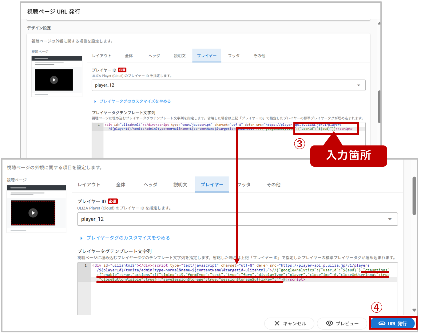 ③「プレイヤータグテンプレート文字列」内の「プレイヤータグテンプレート文字列」内の「{"googleAnalytics": usedId":"${aud}"}」と「}</script>」の間に以下を入力します