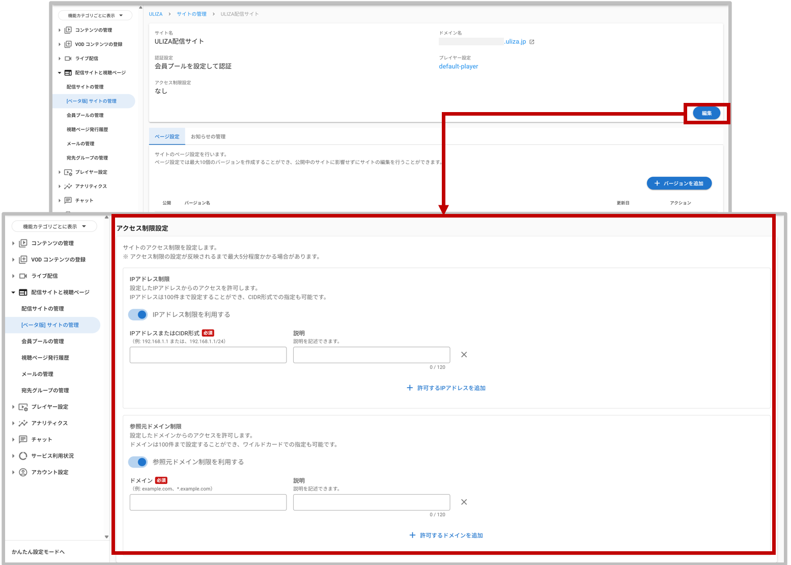 サイトの管理機能を利用いただく際に、サイト毎にIP制限ならびに参照元ドメイン制限をかけることが可能になりました。