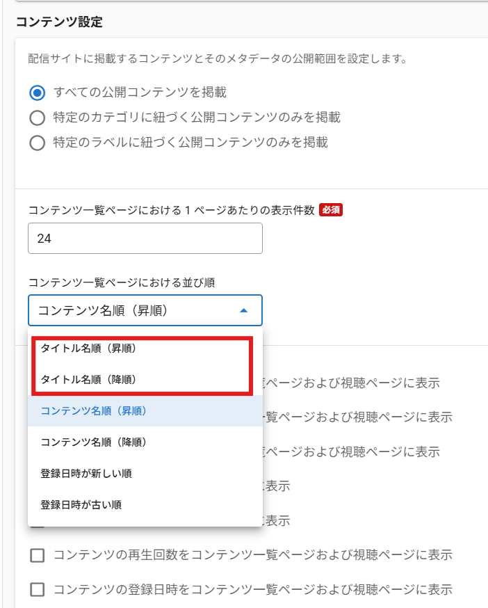 管理画面の配信サイトの設定内の「コンテンツ一覧ページにおける並び順」より指定できます。
