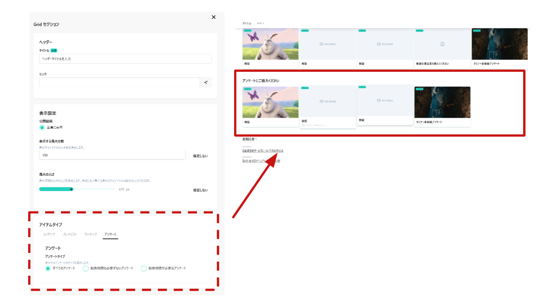 また、アンケートはサイトページ内部でセクションとして任意の場所に配置することも可能になりました