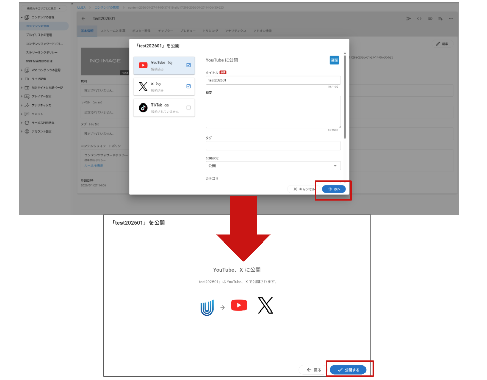 ULIZAで管理している2分以内の短い動画コンテンツを、管理画面から直接各種プラットフォーム(YouTube、X)へ入稿できる新機能がリリースしました。