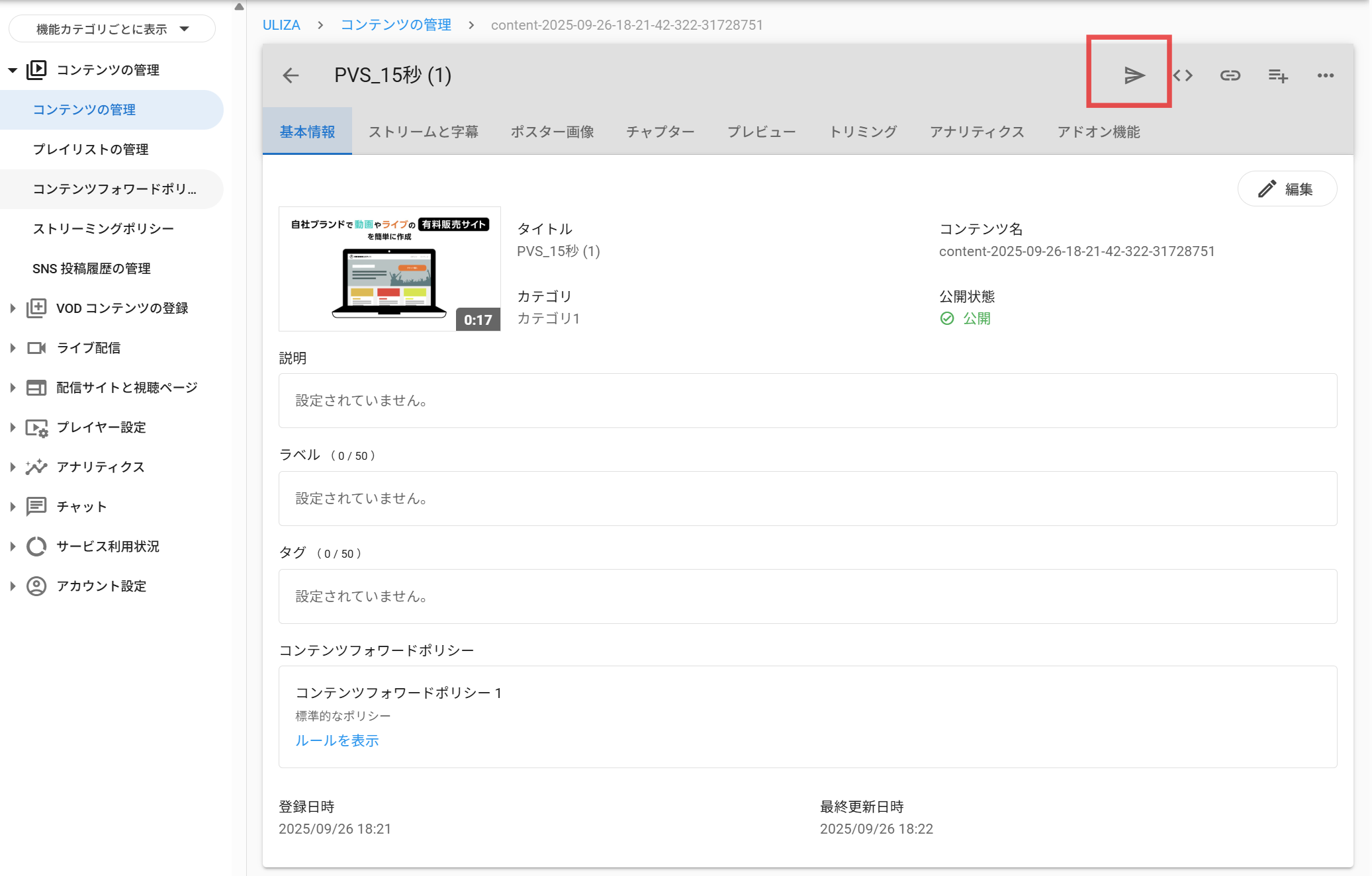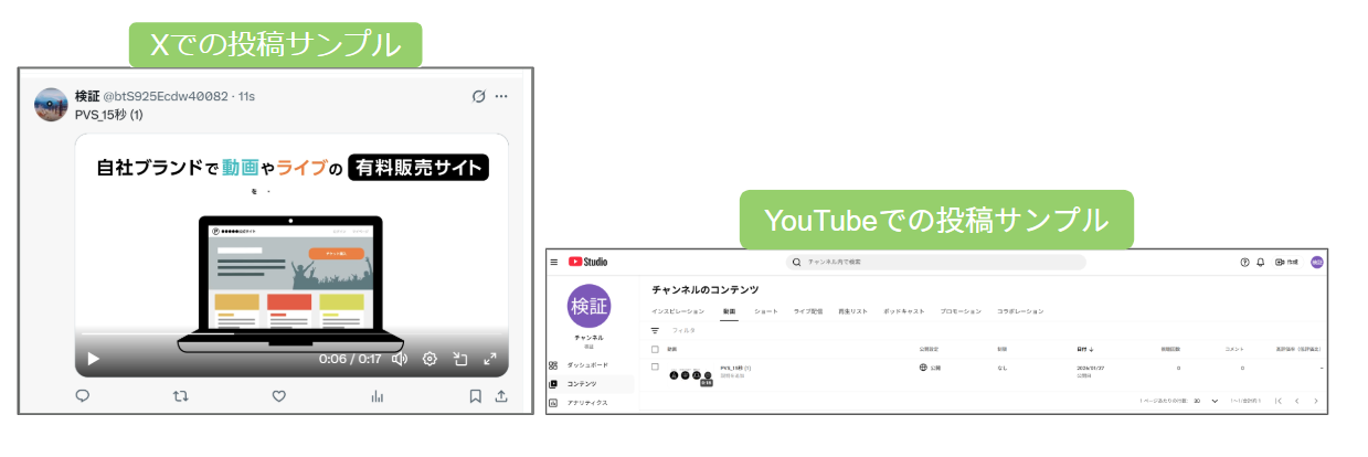 ULIZAで管理している2分以内の短い動画コンテンツを、管理画面から直接各種プラットフォーム(YouTube、X)へ入稿ができます。本機能により、動画管理をULIZAに集約し、各SNSへの投稿作業を一元化することが可能です。