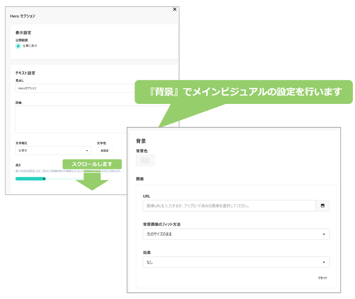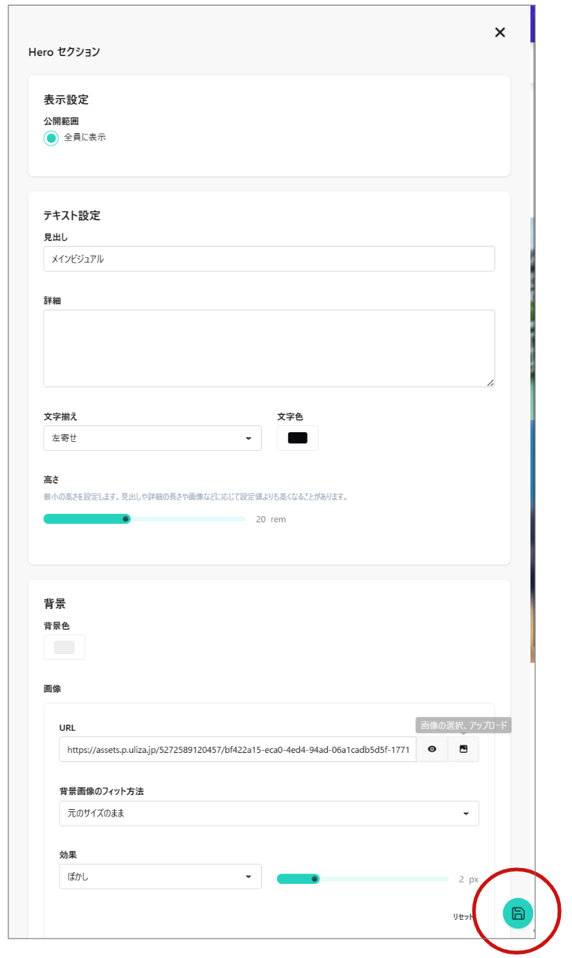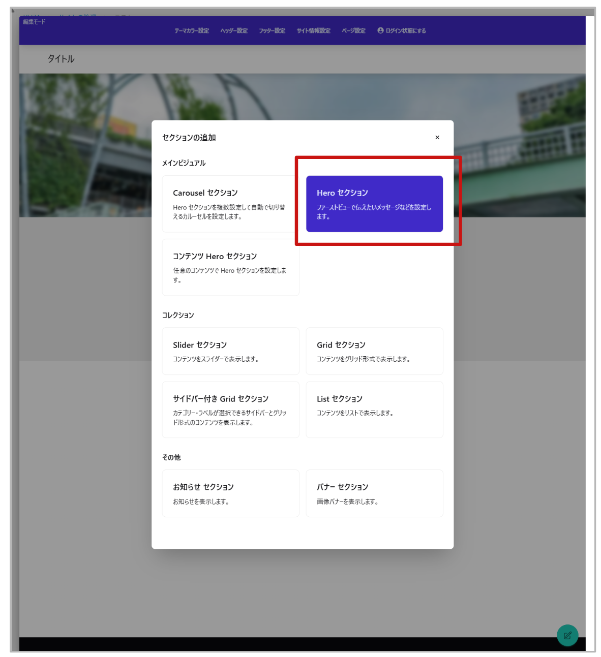 ①セクション追加の際に「Heroセクション」を追加し、背景の設定箇所までスクロールします
