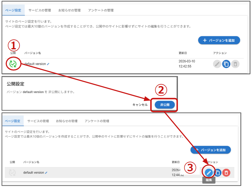 【手順3】ページ設定を開き、編集するバージョンの「編集」をクリックする