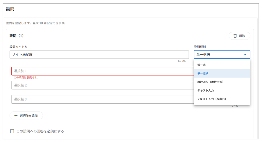 設問は最大で10個設定が可能です。また、設問の種別は『択一式』『単一選択』等から選べます