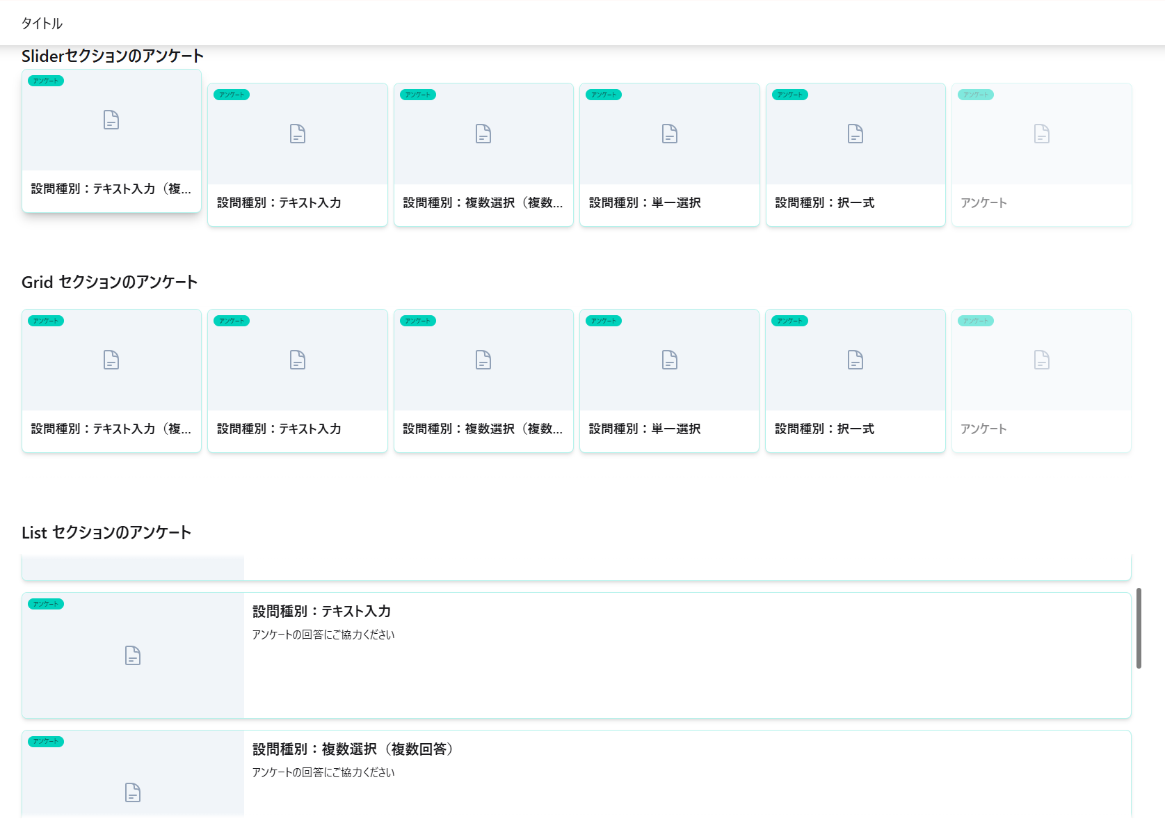 | Listセクション | アンケートをリストで表示します。アンケートが複数ある場合は セクション内をスクロールしてが確認できます |