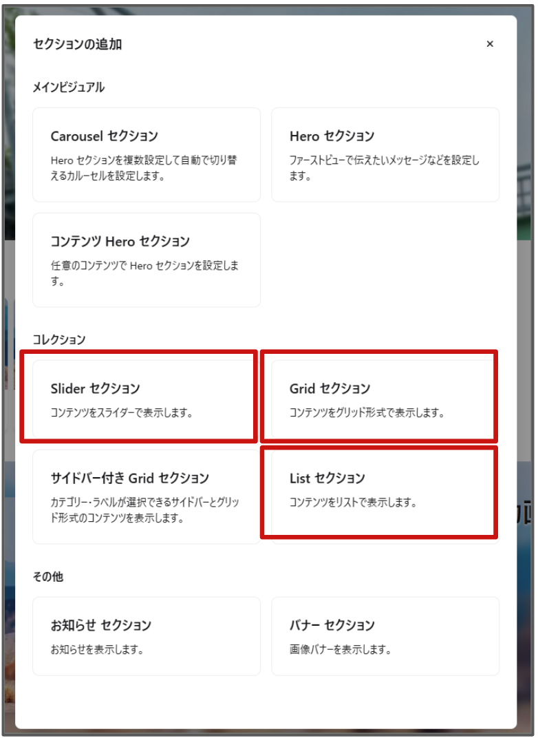 その後、コレクションセクションの『Sliderセクション』『Gridセクション』『Listセクション』のいずれかを選択し追加します