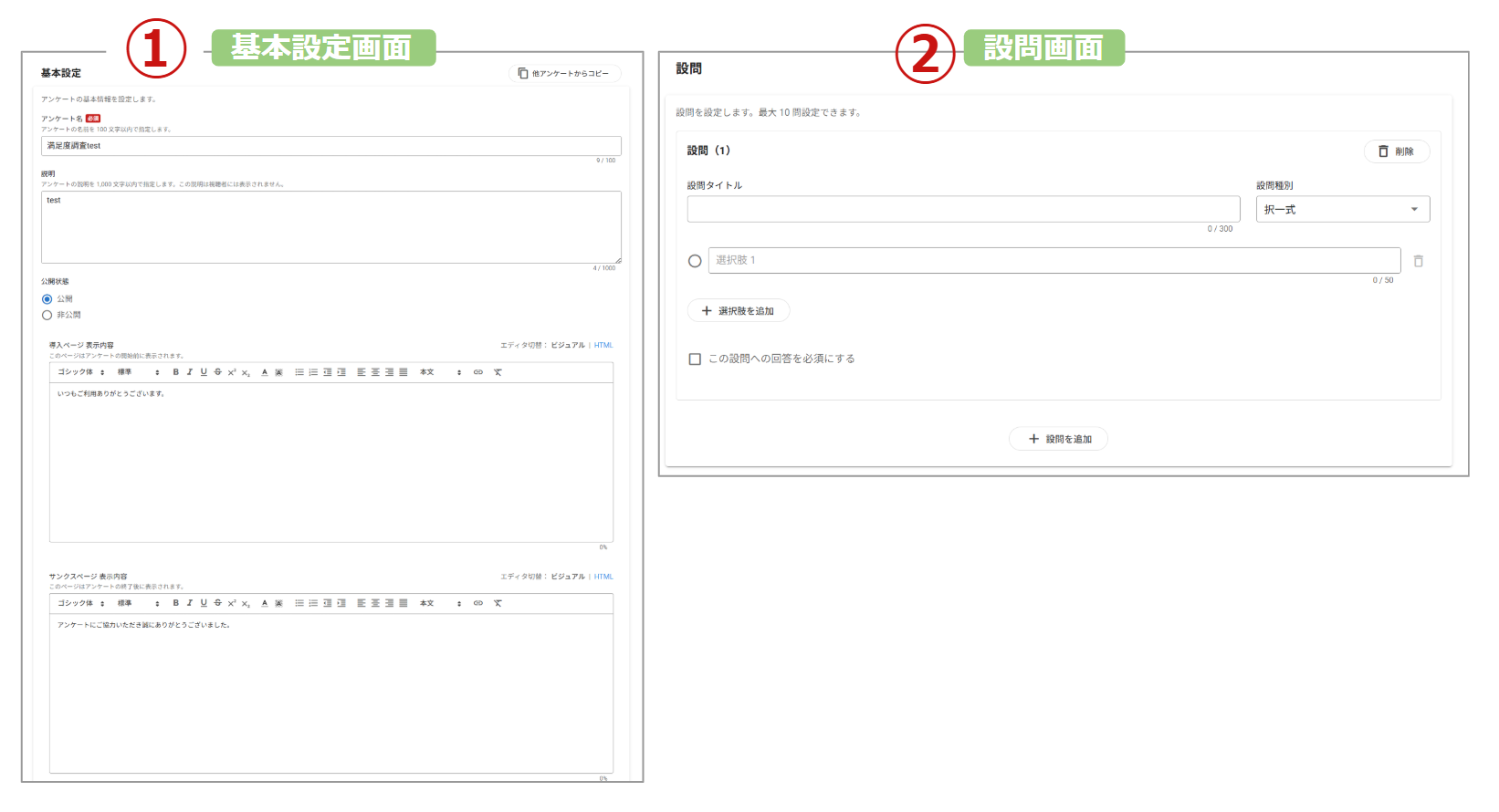 ➀「基本設定」のアンケート名、説明、公開状態、導入ページ表示内容、サンクスページ表示内容などを入力します