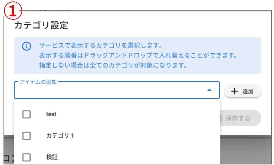 ➀対象カテゴリの設定を行います。アイテムの追加枠より任意のカテゴリを選択します