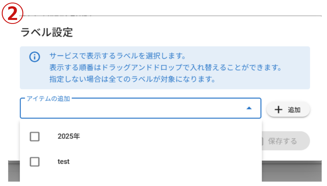 ②対象ラベルの設定を行います。アイテムの追加枠より任意のラベルを選択します