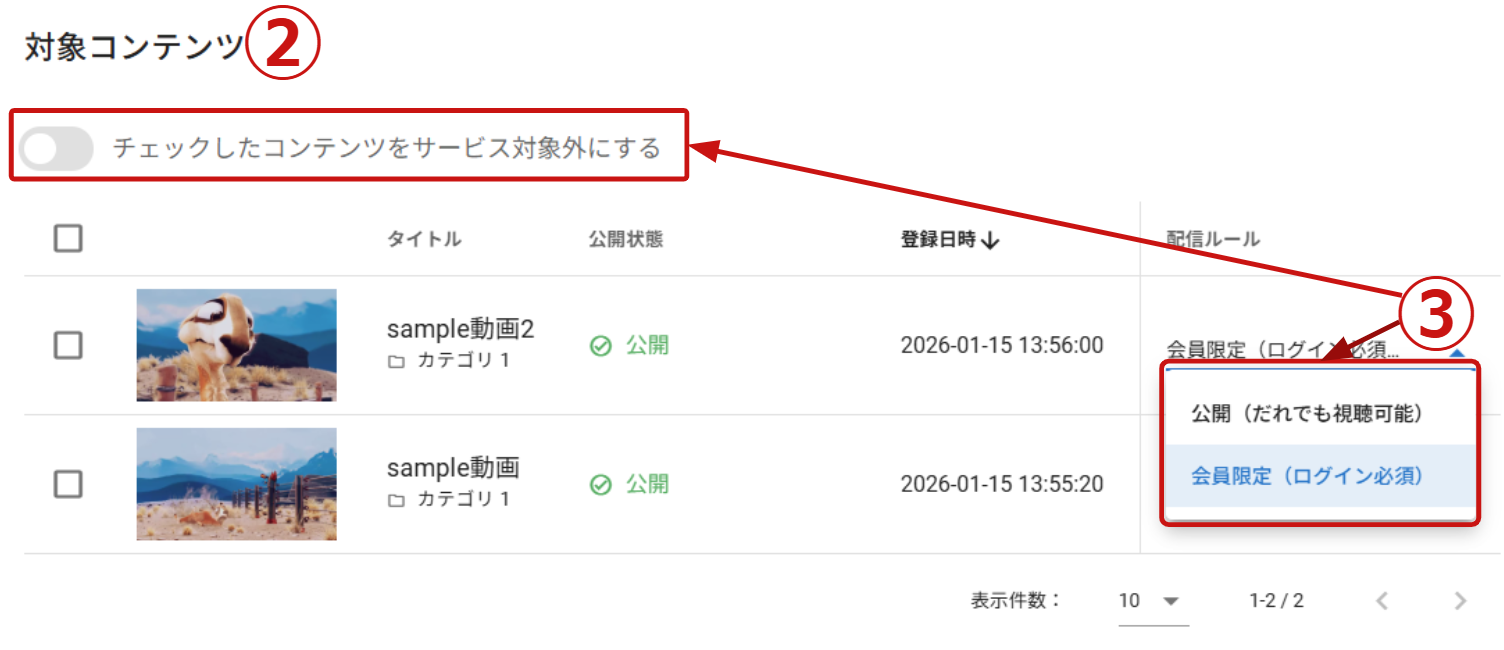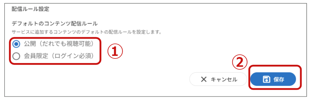 ➀デフォルトの配信ルールを公開(だれでも視聴可能)または