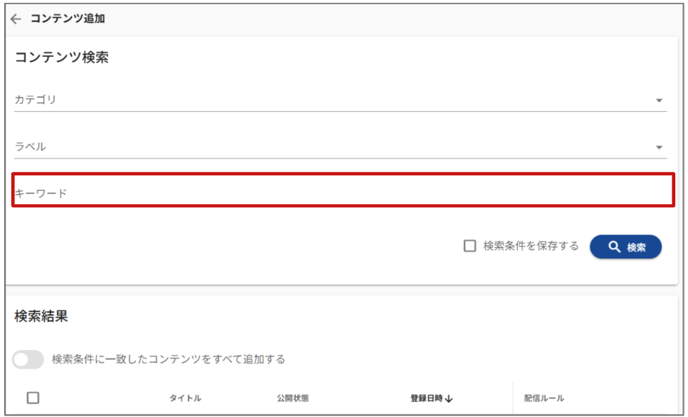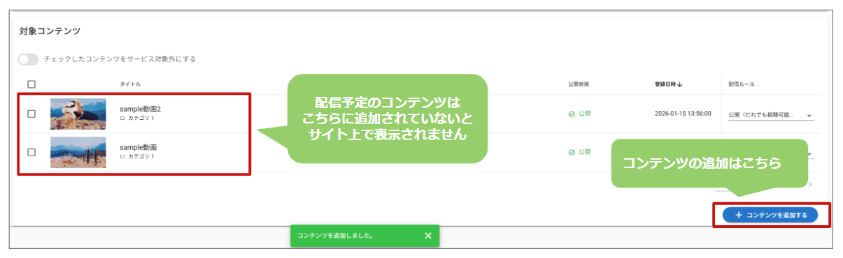 ②選択したカテゴリやラベルのコンテンツが対象コンテンツとして表示されていることを確認します