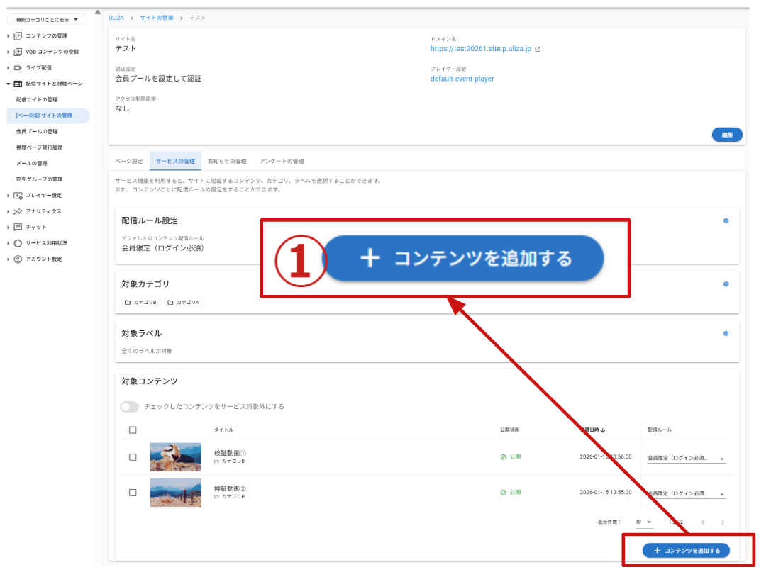 ➀右下の『+コンテンツを追加する』をクリックします