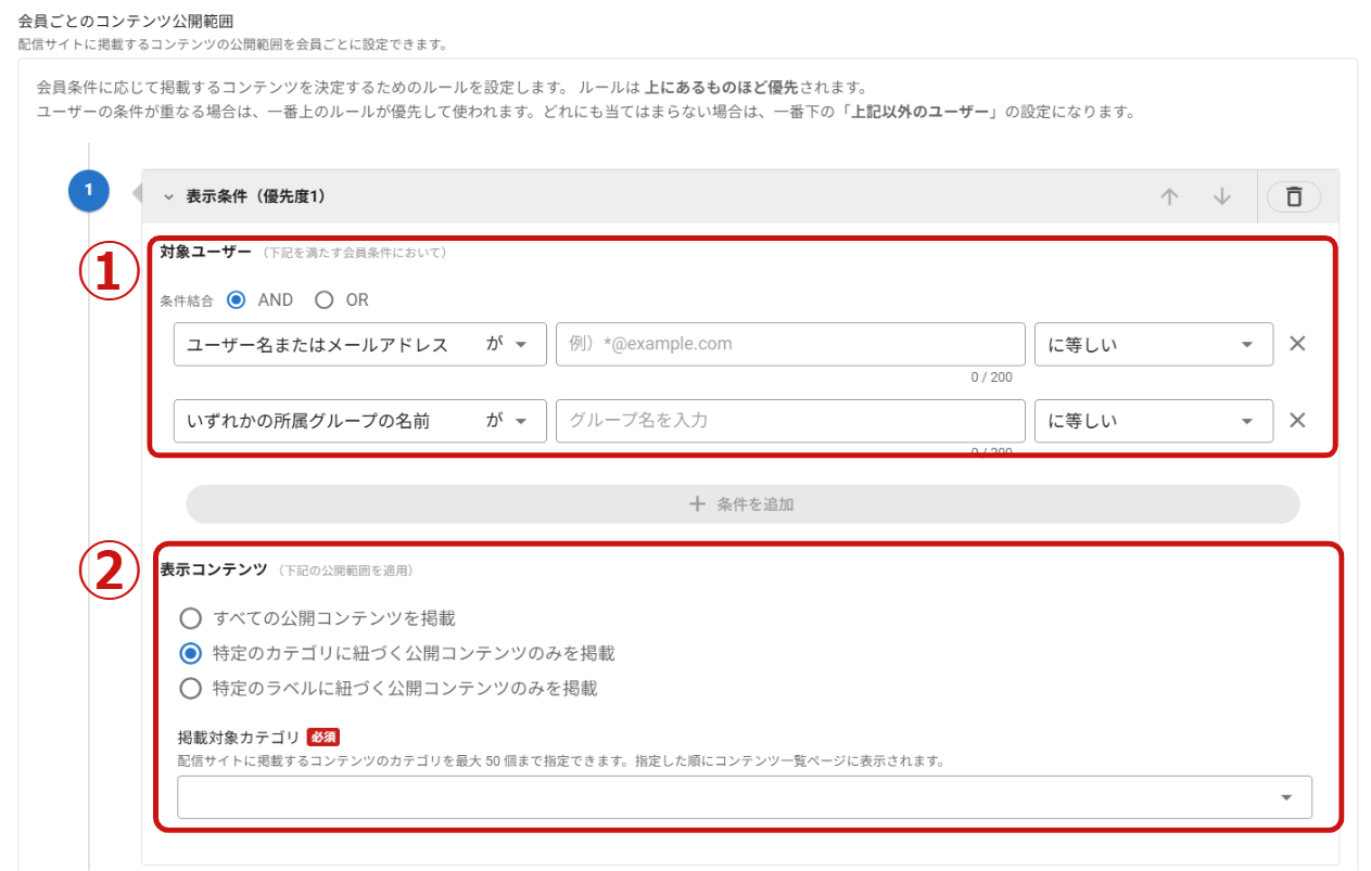 会員条件に応じて掲載するコンテンツを決定するためのルールを設定します
