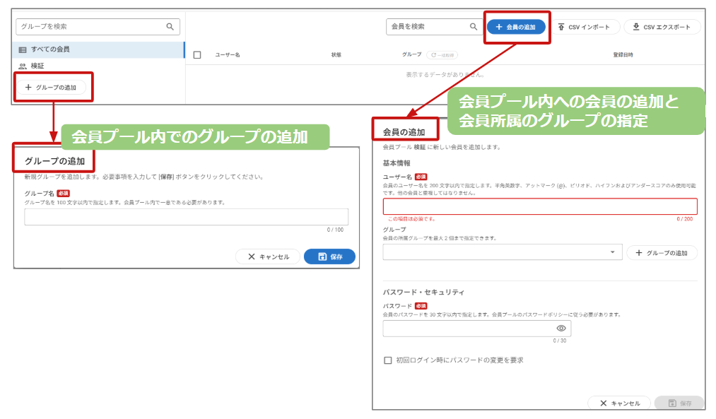 下記の設定画面より、会員プール内でのグループの追加や会員プール内への会員の追加と会員所属のグループの指定が可能です