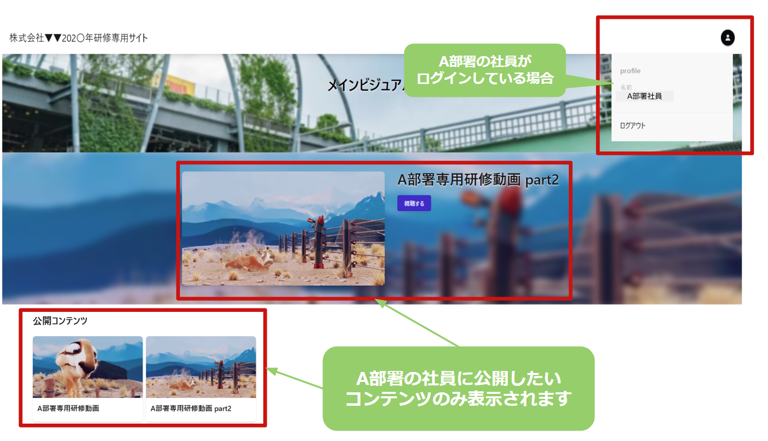 サイトの認証設定で「会員プール」をご利用の場合において、「誰に・どのコンテンツを見せるか」ユーザーごとのコンテンツの出し分けができます。視聴者は自分に関係のある情報だけを迷わず見つけられるようになり、部署別等で厳密な情報の出し分けが可能になります。