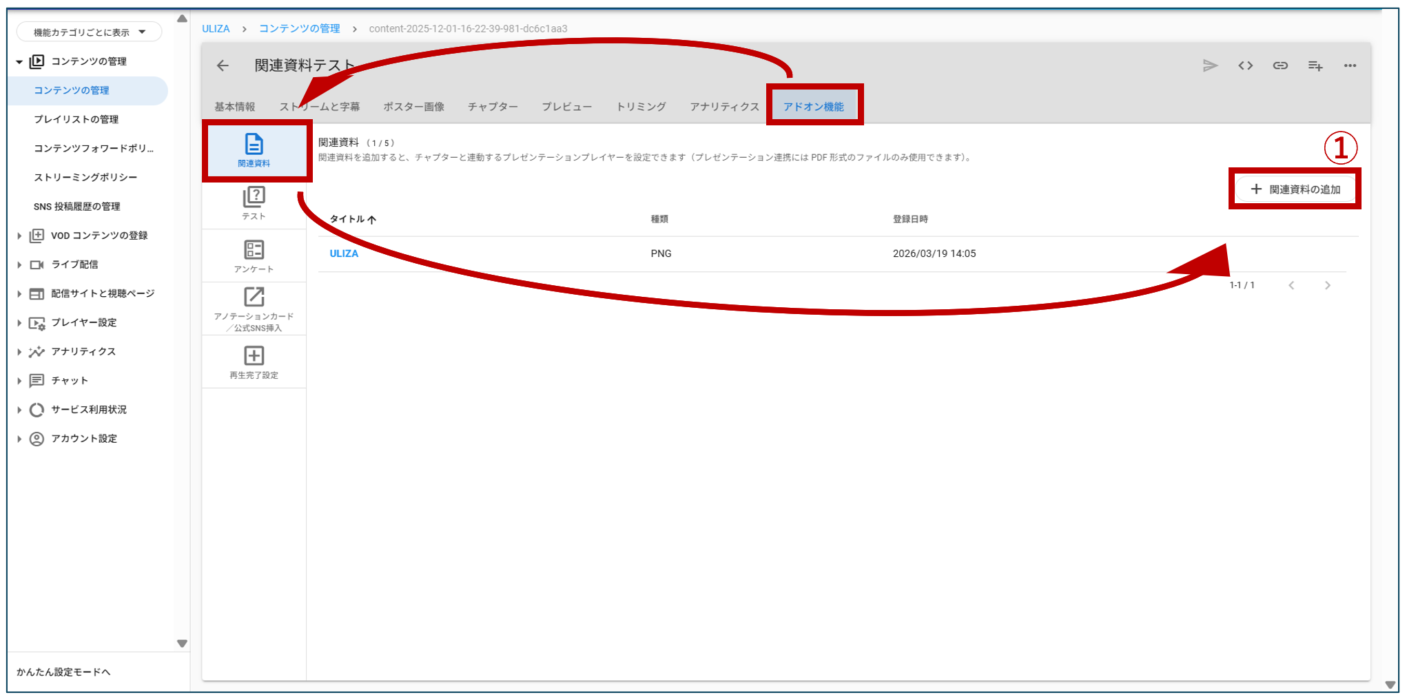 ①「コンテンツの管理」より、「対象のコンテンツの編集」>」「アドオン機能」>「関連資料」>「関連資料の追加」をクリックします