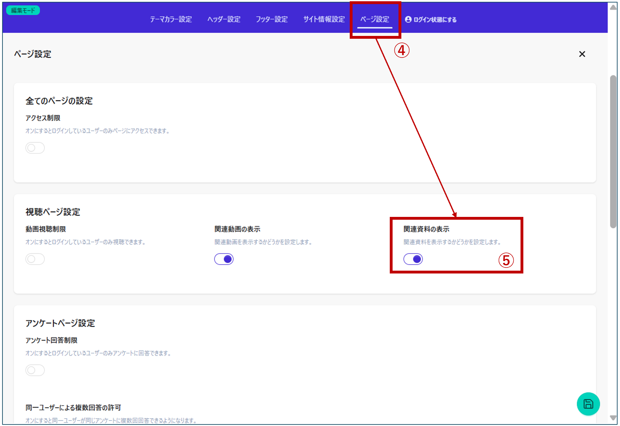 ⑤「関連資料の表示」を有効(ボタンが青くなる)にする